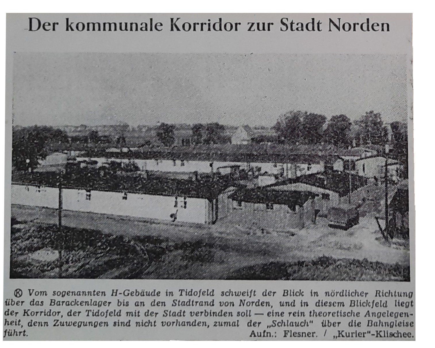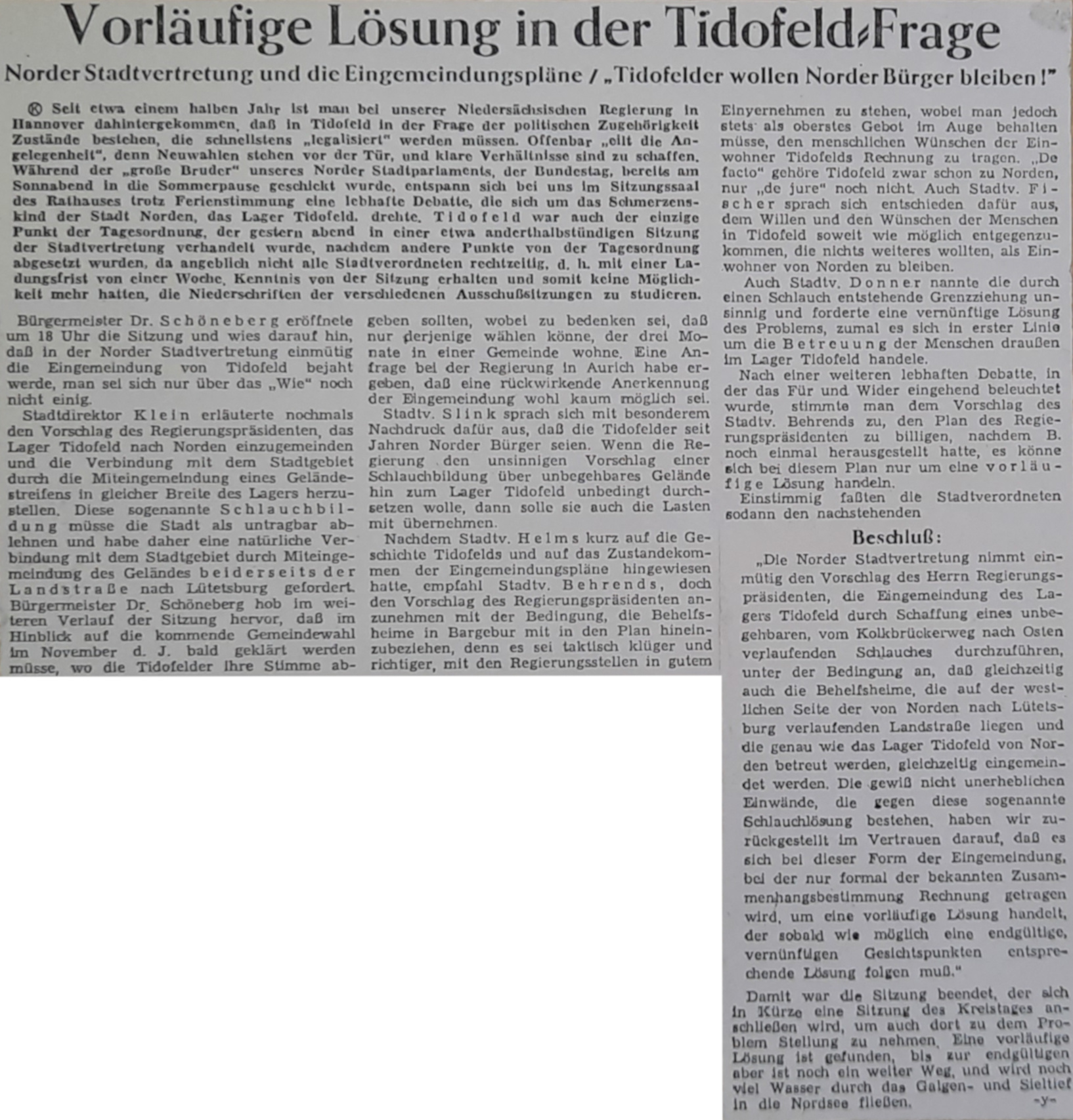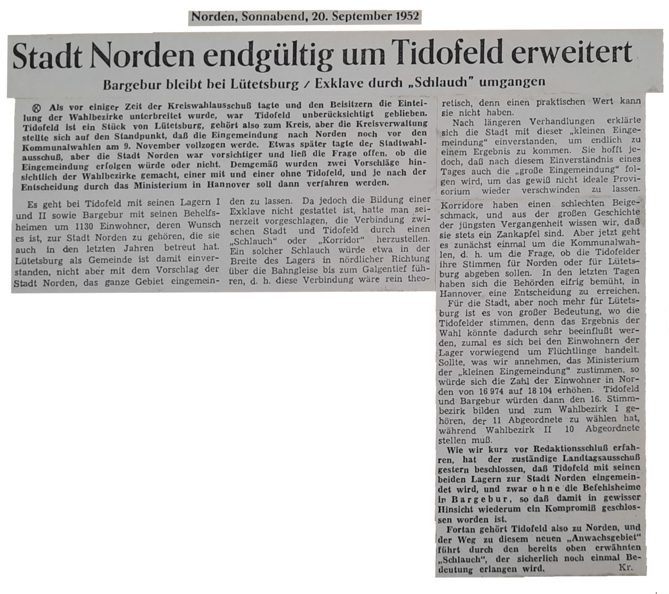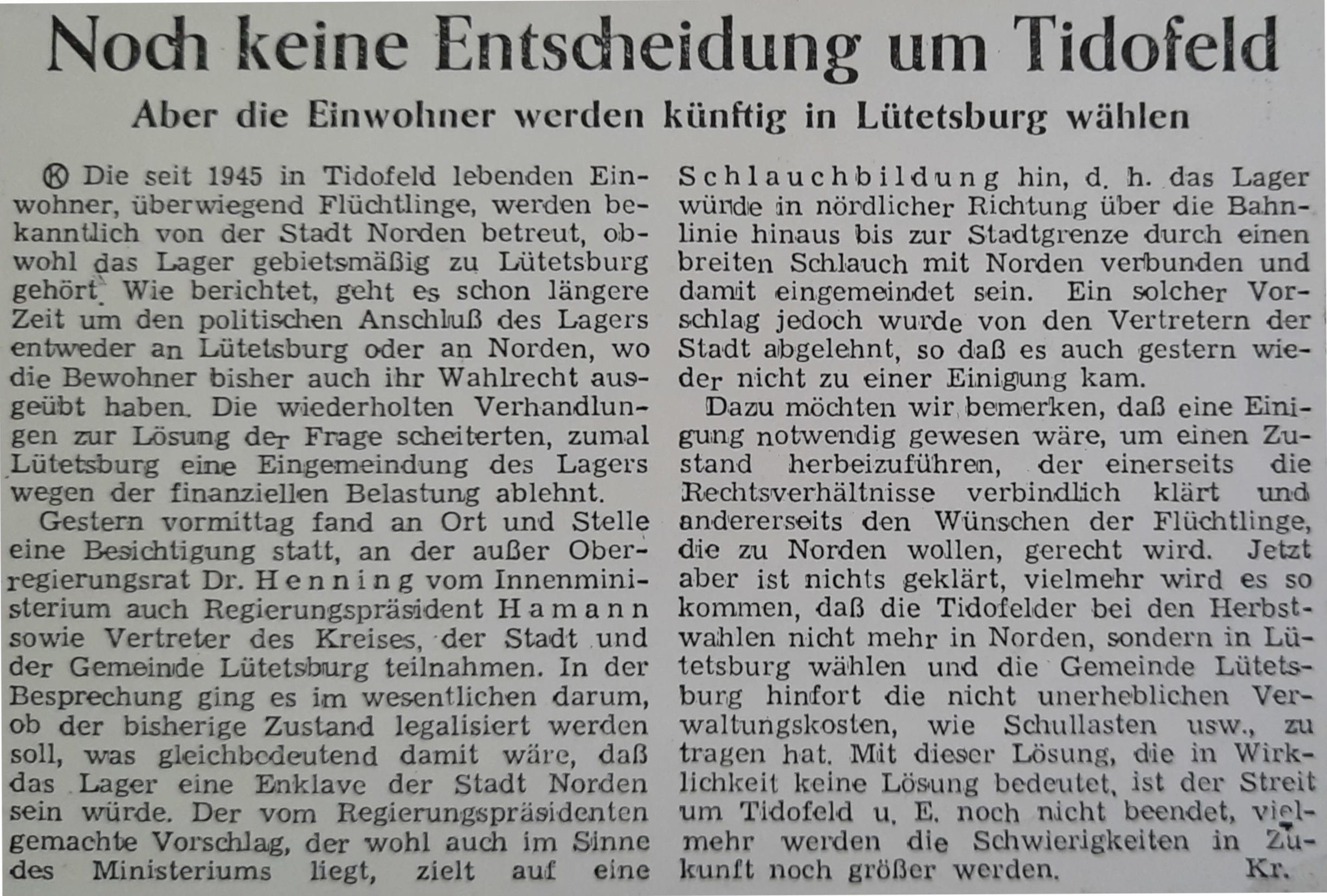 Ursprünglich lag das Vertriebenenlager Tidofeld auf dem Gebiet der Gemeinde Lütetsburg. Die Gemeinde Lütetsburg stimmte der Unterbringung der Vertriebenen in dem ehemaligen Marinelager nicht zu, mehr noch, sie warf der Stadt Norden vor, das Lager mit Vertriebenen zu belegen, die sie auf stadteigenem Gebiet hätte unterbringen müssen. Erst im September 1952 wurden durch einen Erlass der Niedersächsischen Landesregierung Fakten geschaffen: Tidofeld wurde offiziell Ortsteil der Stadt Norden. Diese Entscheidung war im Hinblick auf die Aufteilung der Wahlbezirke von grundlegender Bedeutung: Bei den folgenden Kommunalwahlen hätten ansonsten die Bewohner:innen Tidofelds entscheidend über die Zusammensetzung des Lütetsburger Gemeinderats entschieden. Die begleitenden Artikel aus dem Ostfriesischen Kurier geben einen ausführlichen Einblick in die damalige Debatte.